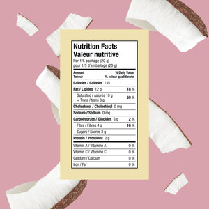 Coconut, Coconut Milk, Coconut Flour, Cacao Nibs, Maple Syrup, Vanilla Extract, Salt.