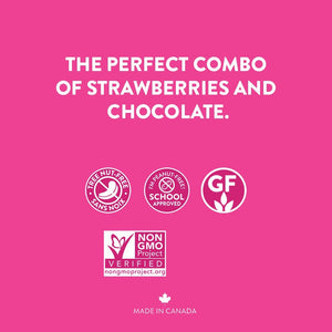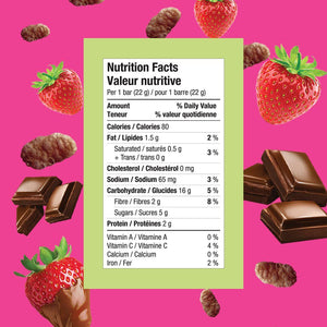 Brown rice, Tapioca fibre, Chicory root fibre, Semi-sweet chocolate chips (sugar, chocolate mass, cocoa butter), Sunflower oil, Vegetable Glycerin, Cocoa powder, Strawberry, Rice syrup, Salt, Fruit and vegetable blend (apple, onion, broccoli, kale, cranberry, raspberry), Agar, Natural flavour, Chickpea.
