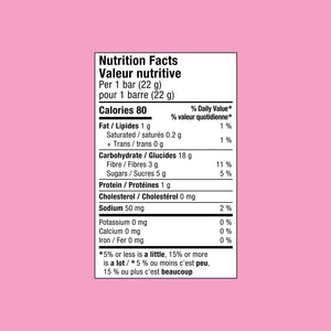 Brown rice, Tapioca fiber, Chicory root fiber, Sunflower oil, Pink sprinkles (sugar, potato starch, maltodextrin, rice bran oil, lemon juice, beet red, carnauba wax), Vegetable Glycerin, Natural flavour, Rice syrup, Salt, Agar, Red Beet Powder, Chickpea.