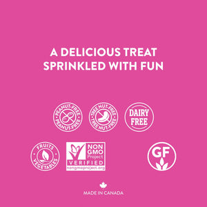 Brown rice, Tapioca fibre, Chicory root fibre, Rainbow sprinkles (sugar, potato starch, maltodextrin, rice bran oil, lemon juice, paprika, anthocyanins, turmeric, beet red, carnauba wax, spirulina extract), Sunflower oil, Vegetable Glycerin, Natural flavour, Rice syrup, Salt, Fruit and vegetable blend (apple, onion, broccoli, kale, cranberry, raspberry), Agar, Chickpea.